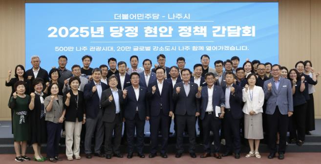 이날 간담회에는 윤병태 시장을 비롯해 신정훈 국회의원, 이재남 시의회의장, 민주당 소속 도의원, 시의원과 지역위원회 당직자 및 보좌진, 강상구 부시장, 간부공직자 등 70여 명이 참석했다.