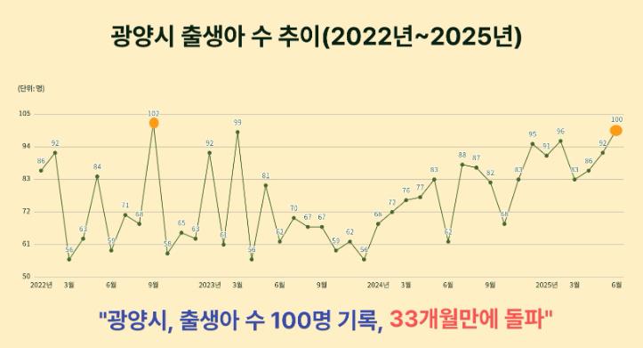 광양시에 따르면, 2025년 6월 출생아 수는 100명으로 전년 같은 달보다 61.3% 증가했다.