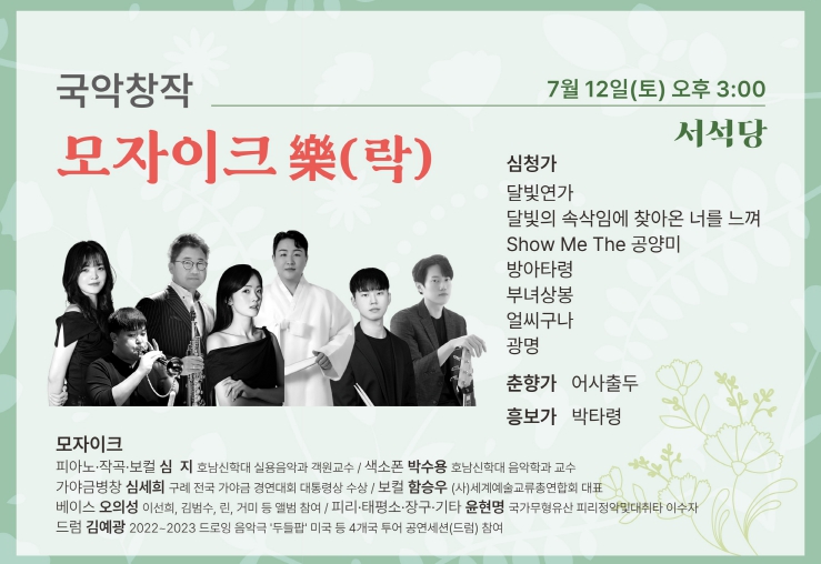‘모자이크’는 피아노, 보컬, 드럼, 색소폰 등 각기 다른 음악적 배경을 지닌 연주자들이 모여, 이질적인 요소들을 섬세하게 결합한 팀이다. 독창적인 구성과 신선한 해석으로 ‘모자이크樂(락)’이라는 고유한 무대를 선보이며, 이름처럼 다채롭고 신선한 음악적 감동을 관객들에게 전하고 있다.