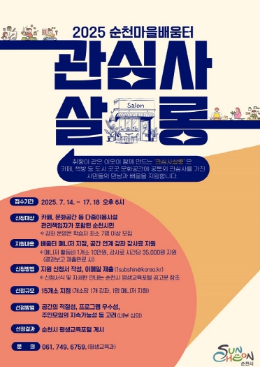 신청 기간은 오는 14일부터 18일까지이며, 순천시 평생교육포털 내 공지사항에서 자세한 내용을 확인할 수 있다. 시는 심사를 거쳐 총 15개소 내외를 선정해 지원할 계획이다.