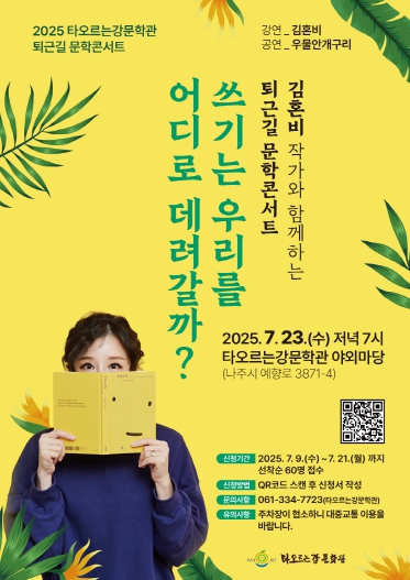 나주시는 오는 7월 23일 저녁 7시 타오르는강문학관 야외마당에서 인기 에세이 작가 김혼비와 함께하는 ‘퇴근길 문학 콘서트’를 개최한다고 11일 밝혔다.