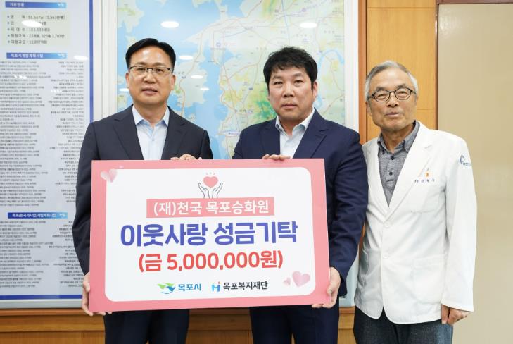 이날 성금 전달식에는 목포시장 권한대행 조석훈 부시장, 자치행정복지국장, 노인장애인과장을 비롯해 재단법인 천국 고원식 이사와 세화산업사 원용태 상무이사, 목포복지재단 강철수 이사장 등 관계자 7명이 참석해 뜻깊은 자리를 함께했다.