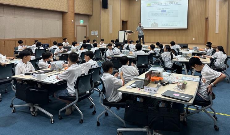 캠프에는 광주교육연구정보원 AI정보영재교육원 교육대상자 중 초등 5~6학년 학생 108명이 참여해 ‘스마트 시티로 구도심 문제 해결!’을 주제로 AI·SW 기반 교구 활용 활동을 펼쳤다.