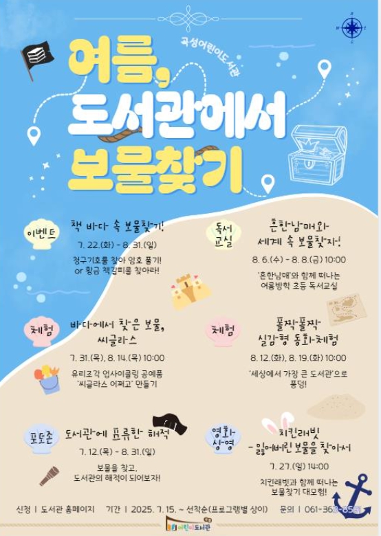 체험활동으로는 7월 31일과 8월 14일에 업사이클링 원데이클래스 '바다에서 찾은 보물, 씨글라스'가, 8월 6일부터 8일까지는 인기도서 활용 여름방학 독서교실 '흔한남매와 세계 속 보물찾기!'가 어린이 75명을 대상으로 진행된다.