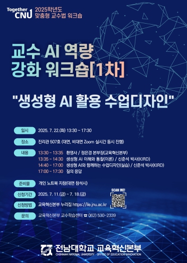 이러한 프로그램의 일환으로, 교원 AI 역량 강화 1차 워크숍이 오는 7월 22일에 대면 및 비대면(Zoom 실시간) 방식으로 동시에 개최된다.