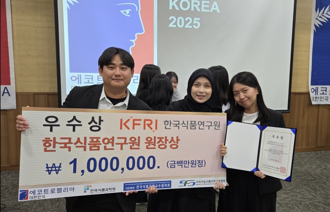 전남대학교는 식품 전공 대학원생들이 지난 7월 2일 서울 코엑스에서 열린 ‘Ecotophelia Korea 2025’ 제1회 혁신식품개발 학생경진대회에서 우수상을 수상했다고 15일 밝혔다. 이번 대회는 전국식품공학교수협의회, 한국식품과학회, 지속가능식품과학기술협회가 공동 주관했다.
