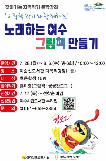 시 관계자는 “이번 문학강좌가 2026여수세계섬박람회 개최지인 여수의 문화와 역사에 대해 지역의 어린이들이 배우고, 작가와 함께 그림책을 만들어 보는 특별한 체험이 되기를 바란다”고 전했다.