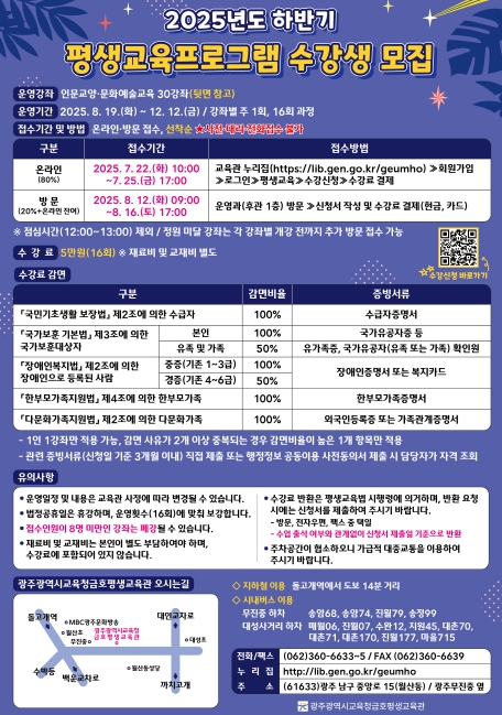 수강 신청은 오는 22~25일에는 금호평생교육관 누리집을 통해 온라인 접수할 수 있으며, 8월 12~16일에는 운영과로 방문 접수하면 된다.