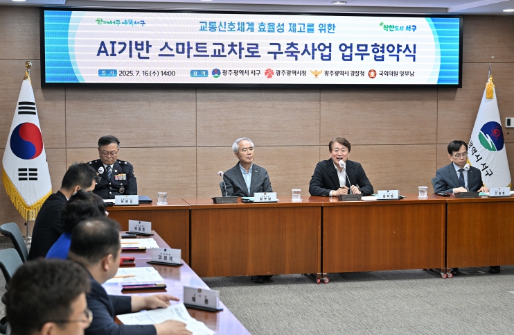 서구는 16일 서구청 나눔홀에서 광주광역시, 광주경찰청과 함께 ‘AI 기반 스마트교차로 구축사업’을 위한 업무협약을 체결했다. 협약식에는 김이강 서구청장을 비롯해 양부남 국회의원, 고광완 광주시 행정부시장, 박준성 광주경찰청 생활안전부장 등 각 기관 관계자들이 참석했다.