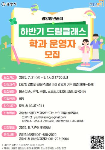 오영숙 광양청년꿈터 센터장은 “상반기 드림클래스가 큰 호응을 얻으며 청년들에게 의미 있는 성장의 기회를 제공한 만큼, 하반기 운영자 모집에도 많은 관심과 참여를 기대한다”며 “청년들이 강사로서 경험을 쌓고 지역사회에 기여할 수 있는 소중한 기회에 적극 도전하길 바란다”고 말했다.