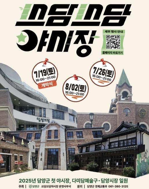 ‘쓰담쓰담 야시장’은 1,000만 관광객 유치에 이어 전국적인 관계인구 유입 확대를 위한 전략 중 하나로, 담양의 여름밤 정취와 문화를 체험할 수 있는 특별한 야간 프로그램이다.