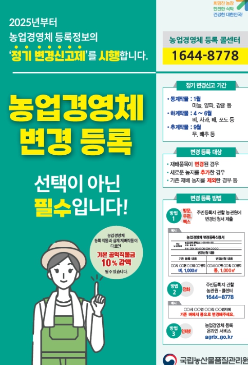 농업경영체 등록 농업인은 공익직불금 등 농업 관련 융자‧보조금 혜택을 받는 대신 재배품목·농지 등이 변경될 경우 반드시 농관원에 변경신고를 해야 하는 의무가 있다.