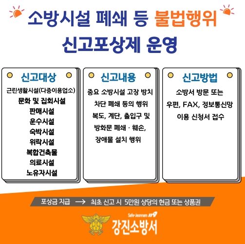 이 제도는 다중이용업소, 문화 및 집회시설, 판매·운수·숙박·의료시설 등에서 ▲비상구·방화문 폐쇄 또는 훼손 ▲소방시설 고장 방치 ▲복도·계단·출입구 등 피난통로 장애물 설치 등의 위법행위를 발견했을 경우, 직접 신고하면 최초 신고 시 5만 원 상당의 현금 또는 상품권을 포상금으로 지급하는 제도다.
