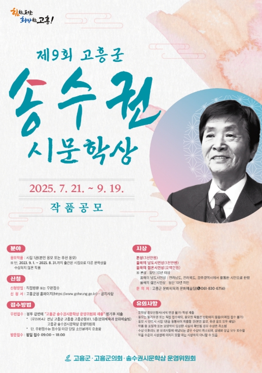 고흥군 관계자는 “송수권 시인의 깊은 서정성을 기리는 이번 문학상이 한국 시문학계에 새로운 활력을 불어넣고, 지역 문학의 품격을 높이는 계기가 되기를 기대한다”며 많은 관심과 참여를 당부했다.