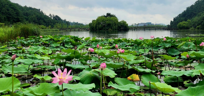 가야산을 병풍처럼 두른 와우생태호수공원은 2개의 아치형 목재다리로 연결된 ‘행운의 섬’을 중심으로 연꽃·부들 군락, 생태관찰섬, 맨발길, 산책로 등을 두루 갖췄다.