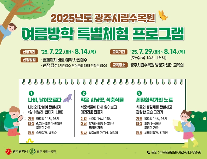 모든 프로그램은 무료로 운영되며, 22일부터 광주시 누리집을 통해 온라인 사전 접수한다. 접수 인원이 미달되면 잔여 인원에 대해 당일 현장에서 선착순으로 받는다. 자세한 사항은 광주시립수목원으로 문의하면 된다.