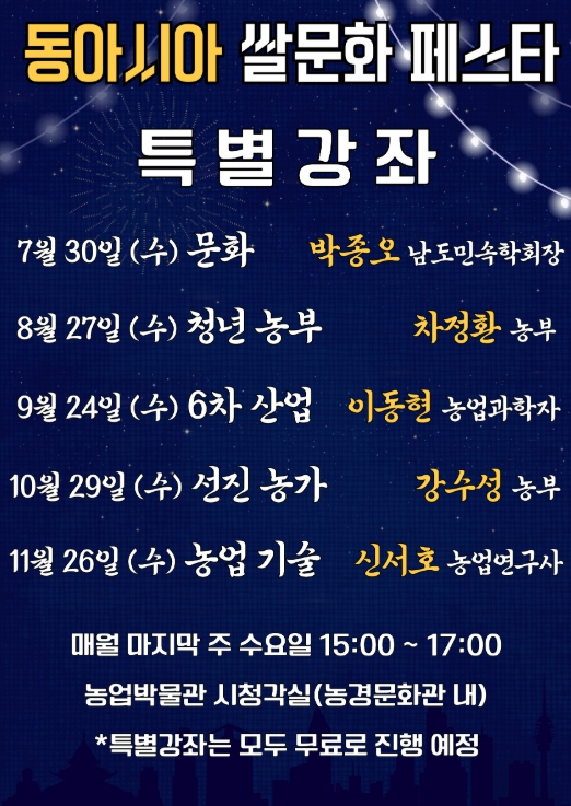 강좌는 전남도농업박물관 특별기획전 ‘동아시아의 미, 쌀 문화’와 연계, 전시를 통해 확인할 수 있는 동아시아 농경문화의 맥락을 더욱 깊이 있게 이해하는 기회를 제공할 것으로 기대된다.