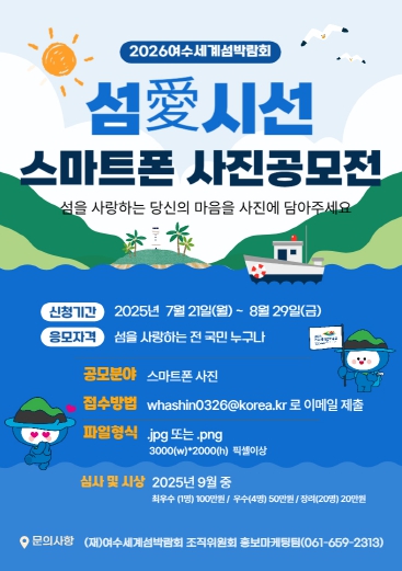 공모전 주제는 ‘섬애(愛) 시선’이다. 여수 섬의 아름다움, 문화, 사람 등 섬을 사랑하는 마음이 담긴 모든 순간을 사진으로 표현하면 된다.