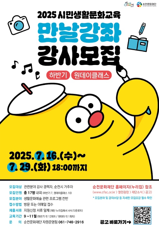 순천문화재단 관계자는 “수강생 모집은 8월 중순 진행될 예정이며, 순천시민이 일상 속에서 문화예술 향유 기회를 넓힐 수 있도록 지역 내 역량 있는 강사 분들의 많은 관심과 참여를 바란다”고 전했다.