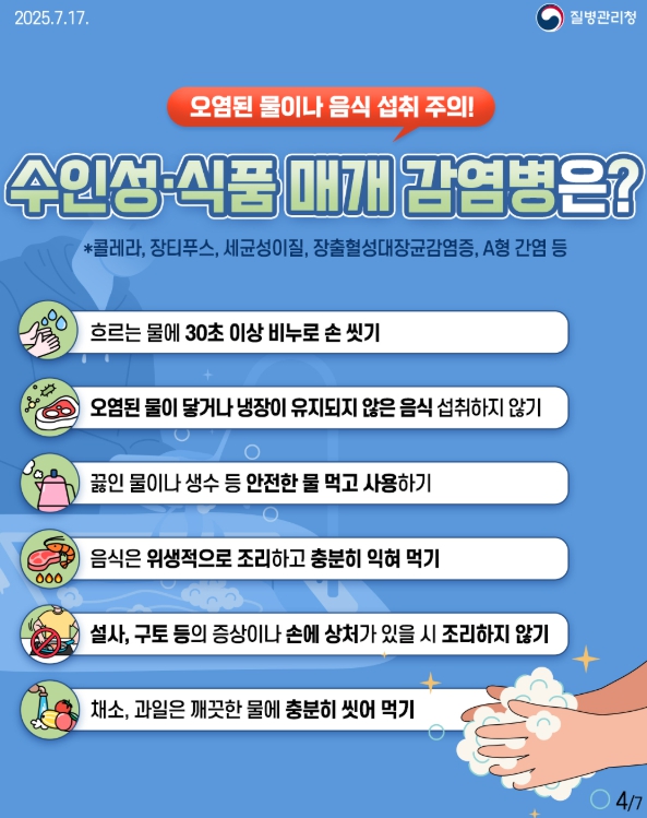 시 관계자는 “집중호우 이후에는 익힌 음식물 섭취와 손 씻기 등 개인위생 관리가 무엇보다 중요하다”며 “발열, 설사 등 감염병 의심 증상이 있을 경우 보건소에 즉시 신고해달라”고 당부했다.
