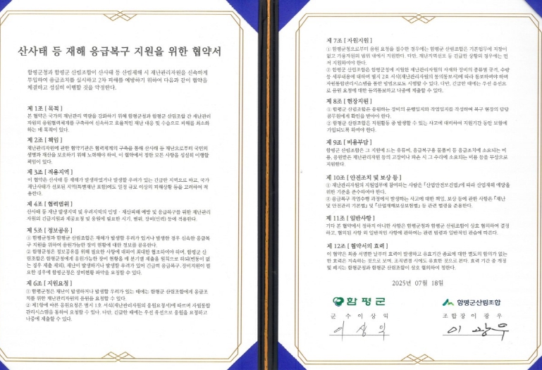이상익 함평군수는 “협약을 통해 산사태와 같은 대규모 재난에 효과적으로 대응할 수 있는 민관 협력 기반이 마련됐다”며, “군민의 생명과 재산을 보호하기 위해 빈틈없는 재난안전망을 구축하겠다”고 말했다.