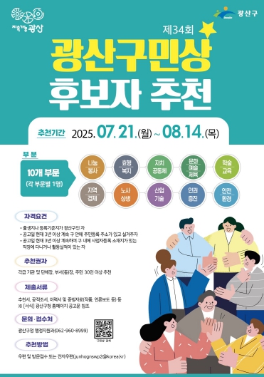 제34회 광산구민상 후보자 추천에 대한 자세한 사항은 광산구 행정지원과로 문의하면 된다.
