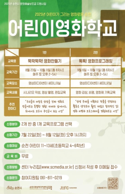 참가 대상은 순천에 거주하는 11 ~ 13세 어린이(초등학교 4~6학년)이며, 순천시영상미디어센터 누리집에서 신청서 작성 후 이메일로 제출하면 된다.