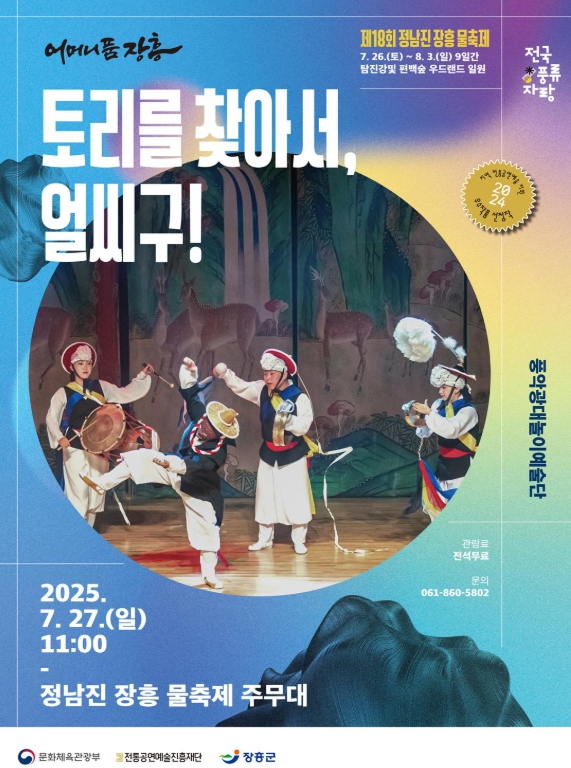 장흥군 관계자는 “제18회 정남진 장흥 물축제 기간동안 개최되는 풍악광대놀이예술단'토리를 찾아서, 얼씨구!'공연에 군민들의 관심과 참여를 바라며 앞으로도 다양한 장르의 공연이 개최될 수 있도록 노력할 것”이라고 전했다.