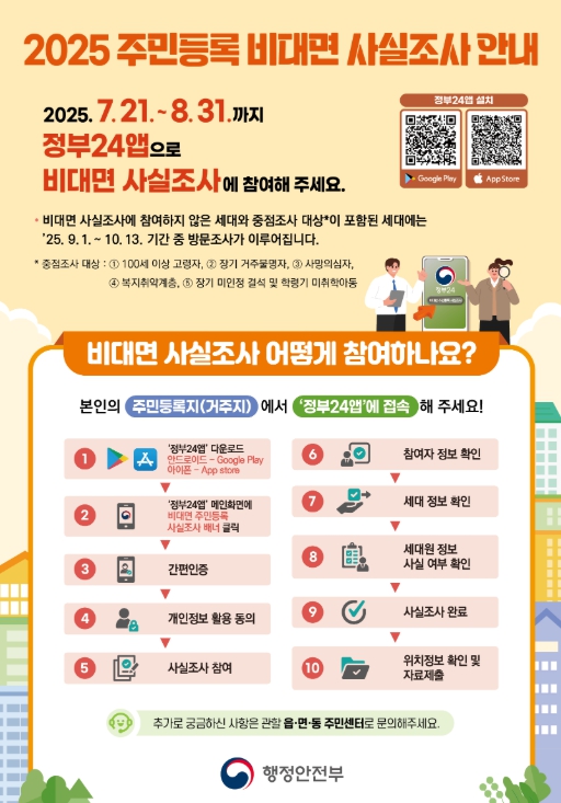 이번 조사는 7월 21일부터 8월 31일까지 스마트폰을 활용한 온라인 조사로 먼저 진행되며, ‘정부24앱’을 통해 간편하게 참여할 수 있다. 별도의 회원가입 없이 일회성 간편 인증만으로 조사에 참여할 수 있으며, 주소지가 동일한 경우 세대원 중 1명이 대표로 세대 전체에 대한 사실조사에 응답할 수 있다.