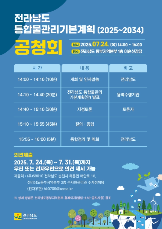 이재원 전남도 수자원관리과장은 “기후위기에 대응하며 도민의 물 복지와 미래세대를 위한 지속 가능한 통합물관리 구축을 목표로, 기본계획(안)이 실행력 있게 수립되고, 이행되도록 도민의 많은 관심과 참여 바란다”고 말했다.