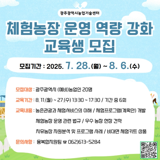 모집대상은 광주광역시 거주 체험농장 운영자 또는 관심 있는 시민 20명이다. 교육 참여 희망자는 8월 6일까지 교육신청서와 관련 서류를 농업기술센터를 방문하거나 이메일 또는 팩스로 제출하면 된다.