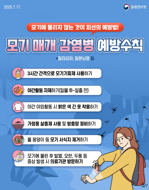 호우 이후에는 모기와 같은 감염 매개체의 서식 환경이 변화하고, 위생 상태가 불량하기 쉬워 감염병 발생 위험도가 높아진다. 특히, 모기 유충은 폐타이어, 인공 용기, 화분 받침, 쓰레기통, 배수구 고인 물 등 다양한 물웅덩이에 서식, 비가 그친 후에는 주변 고인 물 제거와 풀·잡초 정리 등 환경 정비가 중요하다.