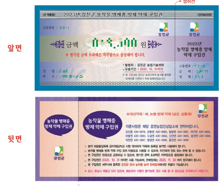올해 군은 벼 병해충 방제에 필요한 예산을 확대 편성해 벼(논콩 포함) 재배면적 전체에 해당하는 8,900ha, 6,301여명의 농업인을 대상으로 ha당 88,800원, 총 7억 9300만원의 벼·논콩 병해충 방제에 필요한 약제 구입권을 이달 말까지 배부하고 다양한 안내를 통해 벼 병해충 방제법과 적기 방제를 적극 홍보하고 있다.