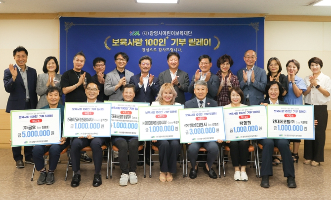 기탁자 및 기탁금액은 △㈜금호(대표 김용호) 500만 원, △㈜혜성티앤시(대표 김영조) 300만 원, △한국농어촌공사 순천광양여수지사(지사장 김기진) 100만 원, △현대데코빌㈜(대표 박문옥) 100만 원, △(사)한국프로사진협회 광양지부(지부장 윤라경) 100만 원, △(사)대한미용사회 광양시지부(지부장 이근자) 100만 원, △탁영희 광양시 농업기술센터 소장 100만 원, △㈜태운(대표 유성종) 100만 원이다.