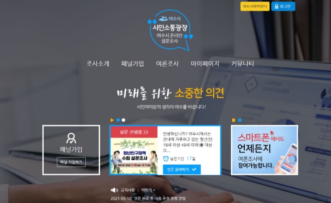 ‘시민소통광장’은 여수시가 시민 의견을 폭넓게 수렴하기 위해 운영 중인 온라인 설문조사 누리집(홈페이지)으로, 현재 여수시 거주자와 출향인 1만여 명이 가입돼 있다.