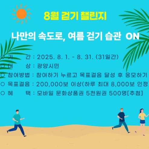 반미순 광양시 건강증진과장은 “여름철에는 충분한 수분을 섭취하고, 낮 시간대의 무더운 시간을 피해 이른 아침이나 저녁 시간대를 활용해 걷는 것이 좋다”며 “걷기 챌린지가 자신만의 속도로 즐겁게 걷는 습관을 형성하는 계기가 되길 바란다”고 말했다.다.
