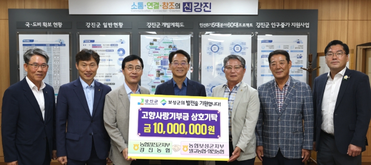 강진군청에서 진행된 상호기부식에는 강진원 강진군수, 장영조 강진군지부 지부장, 진성국 강진농협 조합장, 박정학 보성군지부 지부장, 손영모 벌교농협 조합장, 정각상 회천농협 조합장 등이 참석했다. 김진성 청해푸드랑 대표의 고향사랑기부 기탁식이 차례로 진행됐다.