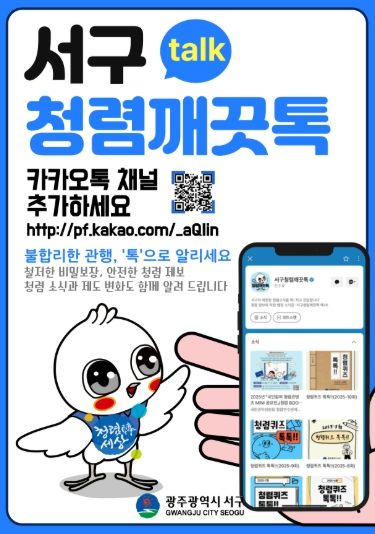 ‘서구청렴깨끗톡’은 카카오톡 채널을 활용한 모바일 청렴 소통 창구로, 공직자와 주민 누구나 쉽게 접근할 수 있는 점이 특징이다. 이 채널은 ▲청렴 제도 안내 ▲부패‧공익신고 절차 안내 ▲위법‧부당 행위 제보 ▲제도 개선 의견 제출 등 다양한 기능을 제공한다.