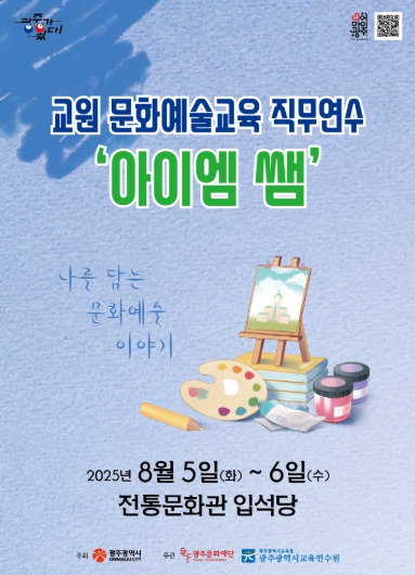 올해 주제는 ‘나를 담는 문화예술 이야기’로, 광주지역 유․초·중등 교원 30여 명이 참여해 체험·성찰·협력 중심의 문화예술교육 프로그램을 운영한다. 특히 이번 연수에는 교장, 교감, 교사, 원감, 교육연구사 등 다양한 직군의 교원이 함께해 현장 경험을 폭넓게 공유하며, 모집 하루 만에 마감될 만큼 높은 관심을 모았다. 본 연수는 광주문화재단과 광주광역시교육청 교육연수원이 협력해 추진한다.