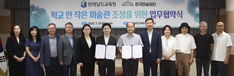 전남교육청과 한국미술재단은 29일 청사 비즈니스실에서 ‘학교 안 작은 미술관 사업을 위한 업무협약’을 체결하고, 학생들이 일상속에서 예술작품을 감상하며 창의력과 감수성을 키울 수 있도록 학교예술교육 기반을 구축하는 데 힘을 모으기로 했다.