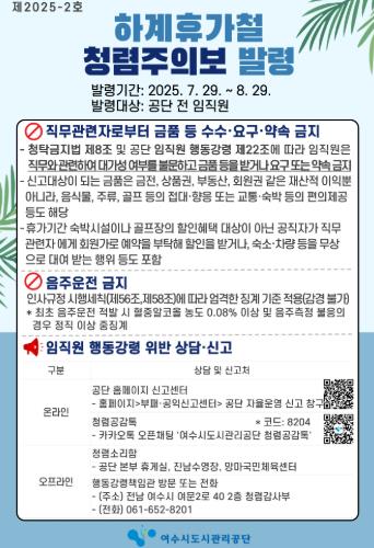 이번 청렴주의보는 휴가 기간 중 발생할 수 있는 금품 수수, 음주운전 등 비위행위를 사전에 예방하고, 임직원의 행동강령 준수를 강조하기 위해 시행됐다.