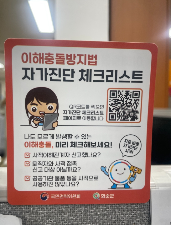 화순군은 이해충돌 상황에 대한 체크리스트를 마련하던 중 권익위가 배포한 자가진단 체크리스트를 확인해 기존 제도를 활용하기로 방침을 정하고 권익위와 사전협의를 마쳤다.