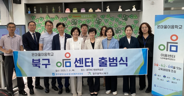 광주시민협치진흥원은 31일 북구평생학습관에서 이명숙 동부교육지원청 교육장, 김진구 광주시민협치진흥원장, 광주 북구 이승미 문화교육국장 등이 참석한 가운데 ‘온마을이음학교 북구 이음센터’ 개소식을 개최했다. 이어 오는 8월 1일에는 5개 자치구 중 마지막으로 남구청에 ‘온마을이음학교 남구 이음센터’를 개소한다.