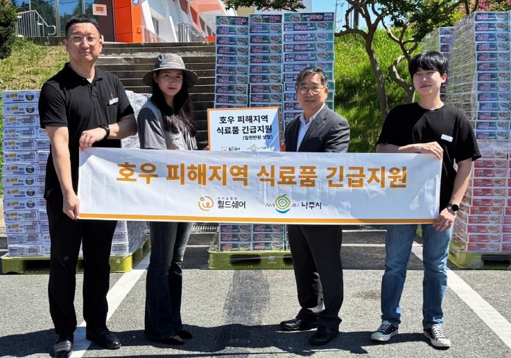 1일 나주시에 따르면 월드쉐어가 기록적 폭우로 주택이 침수된 시민 80여명을 지원하고자 라면, 생수, 즉석밥 등 식료품을 지원했다.