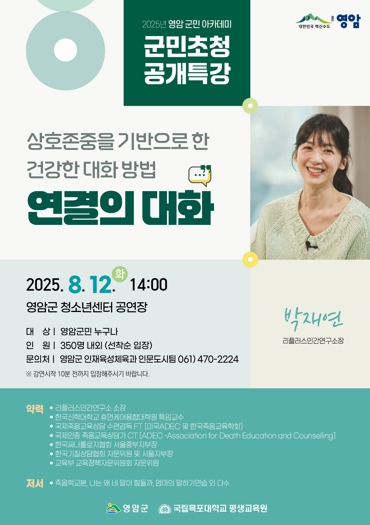 노재영 영암군 인재육성체육과장은 “가족과 이웃, 직장 내 소통에 어려움을 겪고 있는 이들에게 도움을 주는 특강이다. 더 나은 소통을 생각하는 자리에 많은 영암군민의 관심과 참여 바란다”고 전했다.