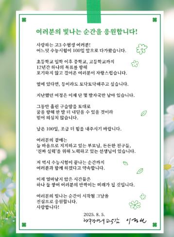 이 교육감은 편지를 통해 “초・중・고 12년간 하나의 목표를 향해 포기하지 않고 걸어온 여러분이 자랑스럽다. 남은 100일 조금 더 힘내길 바란다.”며 “저 역시 수능시험이 끝나는 순간까지 함께할 것을 약속하며, 여러분의 빛나는 순간이 시작될 그날을 진심으로 응원한다”고 전했다.