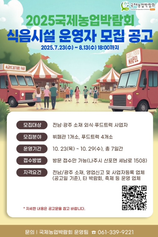 이번 모집은 주제전시관인 농업미래관 옆 뷔페관(288석·600㎡)과 행사장 내 푸드트럭을 대상으로 진행한다.