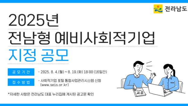 이번 전남형 예비사회적기업 지정 신청 기간은 19일까지며, 신청서와 구비서류를 갖춰 사회적기업 포털 통합사업관리시스템에 제출하면 된다.