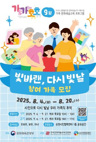 순천문화재단 관계자는 “프로그램 모집마다 정원이 넘는 신청자가 접수되는 등 가족문화예술교육에 대한 순천시민의 높은 관심을 느낄 수 있었다. 이번에 진행되는 ‘빛바랜, 다시 빛날’ 프로그램도 가족과 마음을 나누며 추억을 만들고 싶은 가족들의 많은 관심과 참여를 바란다”고 전했다.