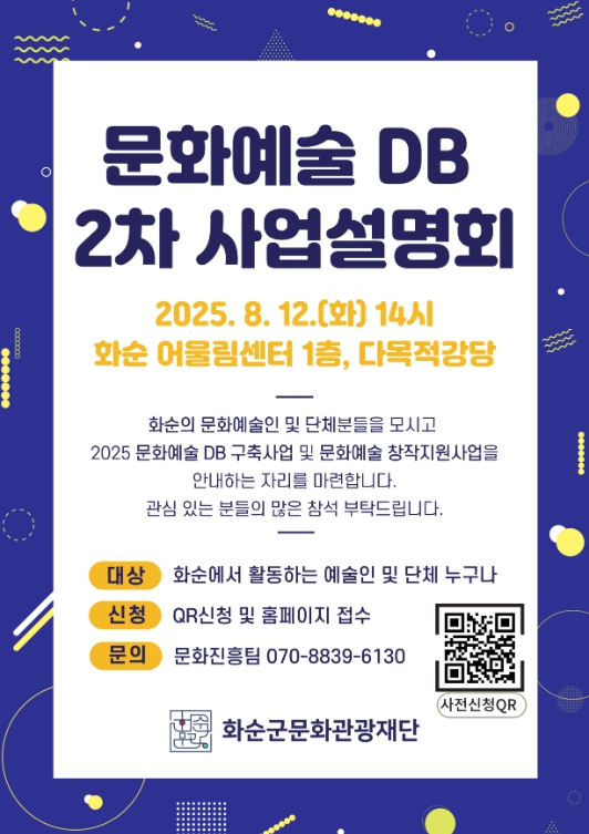 이번 설명회는 ▲(재)화순군문화관광재단 기관 소개 ▲(재)화순군문화관광재단 주요 사업 소개 ▲문화예술인 DB 구축 사업 및 구축 현황 소개 ▲2025 문화예술창작지원사업 소개 ▲문의 사항 및 네트워크 순으로 진행될 예정이다.